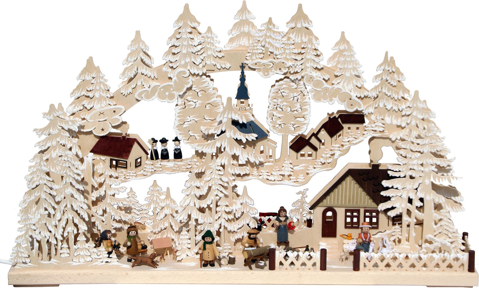 Der Schwibbogen zeigt eine Szene aus dem Dorfleben. Vor der Kirche singt eine Kurrende. Zu sehen sind auch Waldarbeiter, Pilz- und Holzsammler sowie verschiedene Frauen. Im Wald befinden sich Rehe an der Futterkrippe.