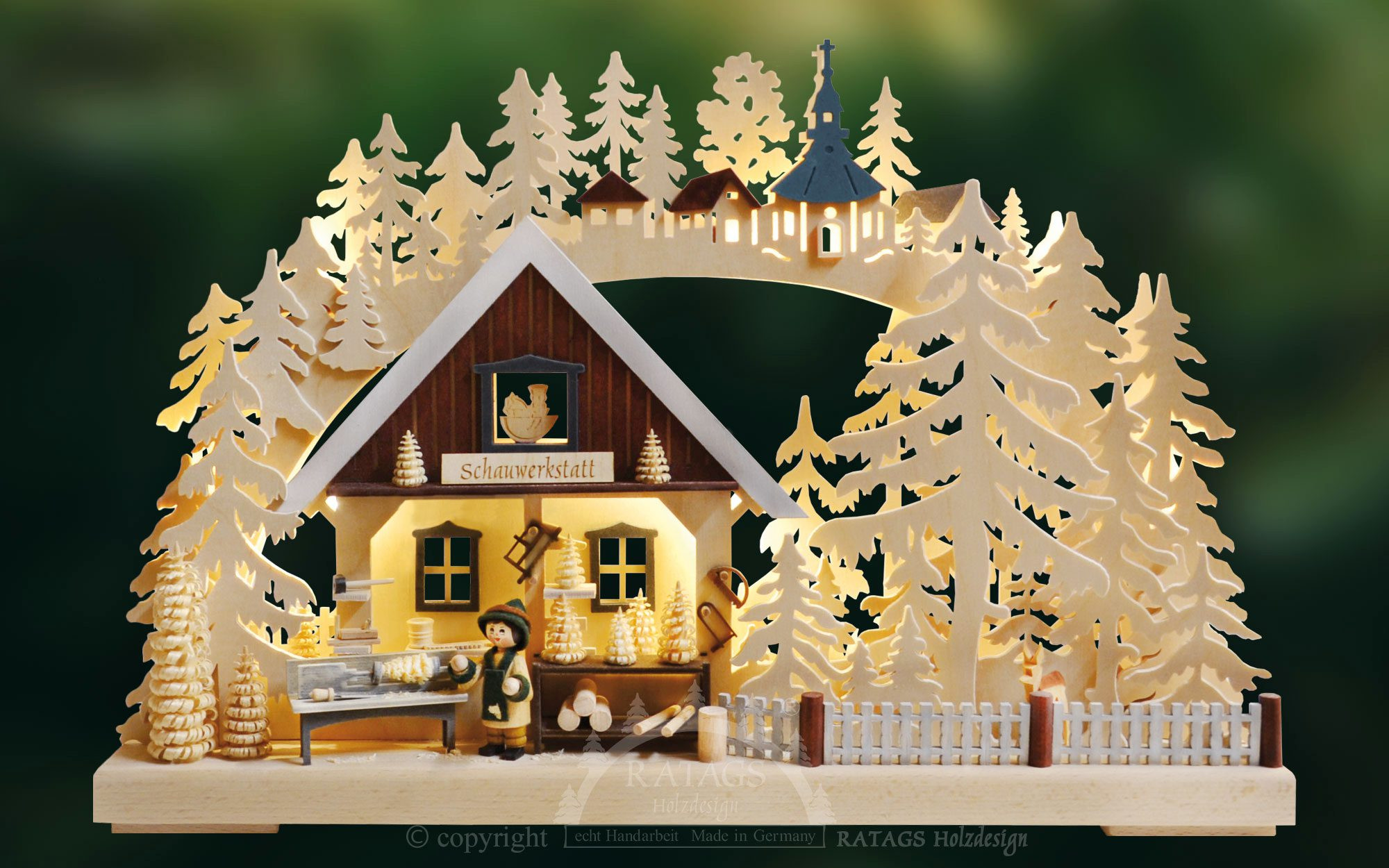 Diese kleine Drechslerei zeigt wie die kleinen Spanbäume der erzgebirgischen Volkskunst hergestellt werden. Im Hintergrund sieht man die Seiffener Kirche mit ein paar weiteren Häusern.