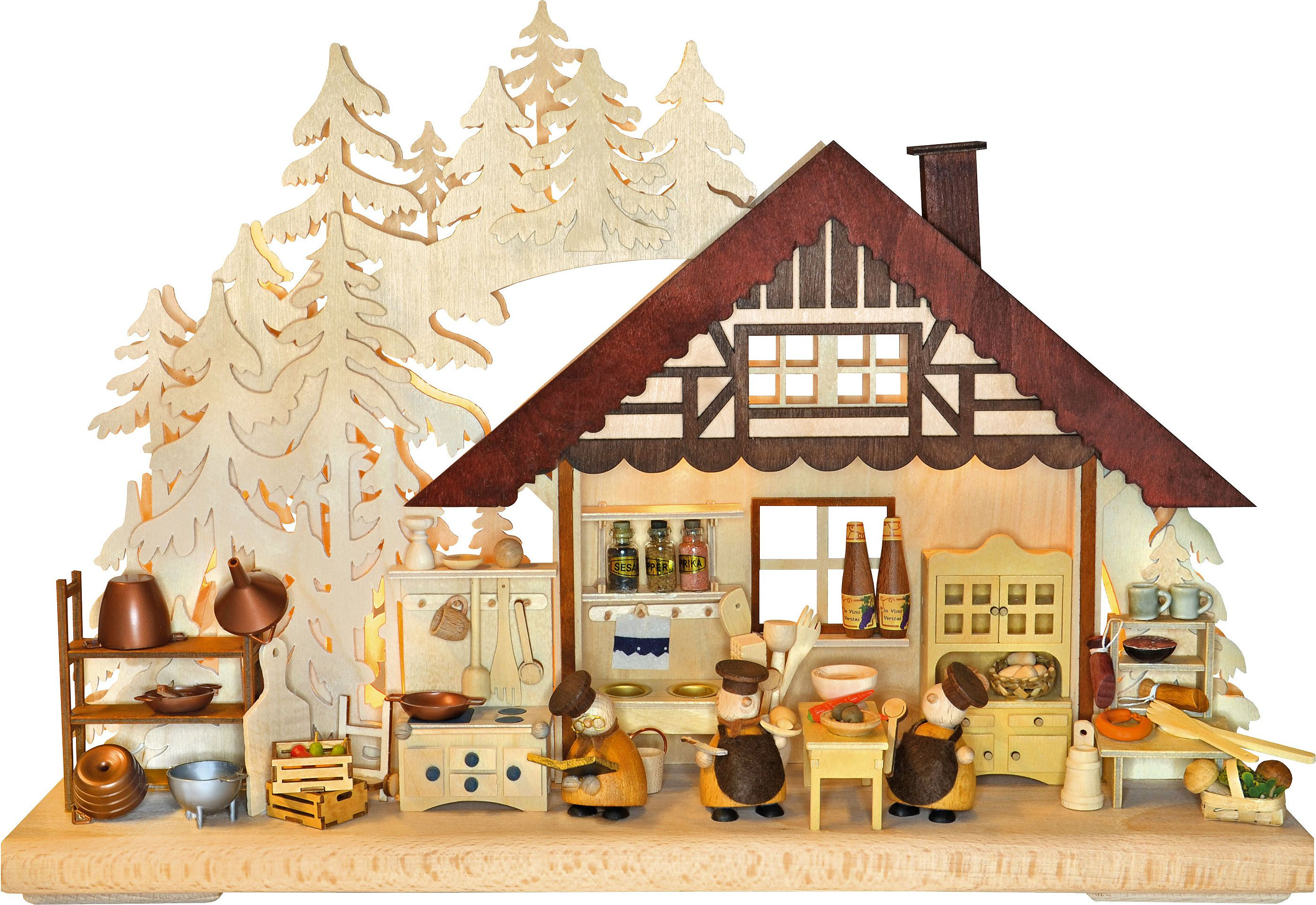 Bei diesem Artikel handelt es sich um einen kleinen 3D-Schwibbogen der Firma Ratags. Drei mit Kochmützen und Schürzen gekleidete Figuren sind in der Küche eines Fachwerkhauses mit Messer und Kochlöffel zu Gange. Die Küche ist mit frischen Zutaten, Kochutensilien, Geschirr und Gewürzen ausgestattet. Die Szenarie des Bogens wird von Bäumen ergänzt. Für die Beleuchtung wird eine indirekte LED-Beleuchtung verwendet.