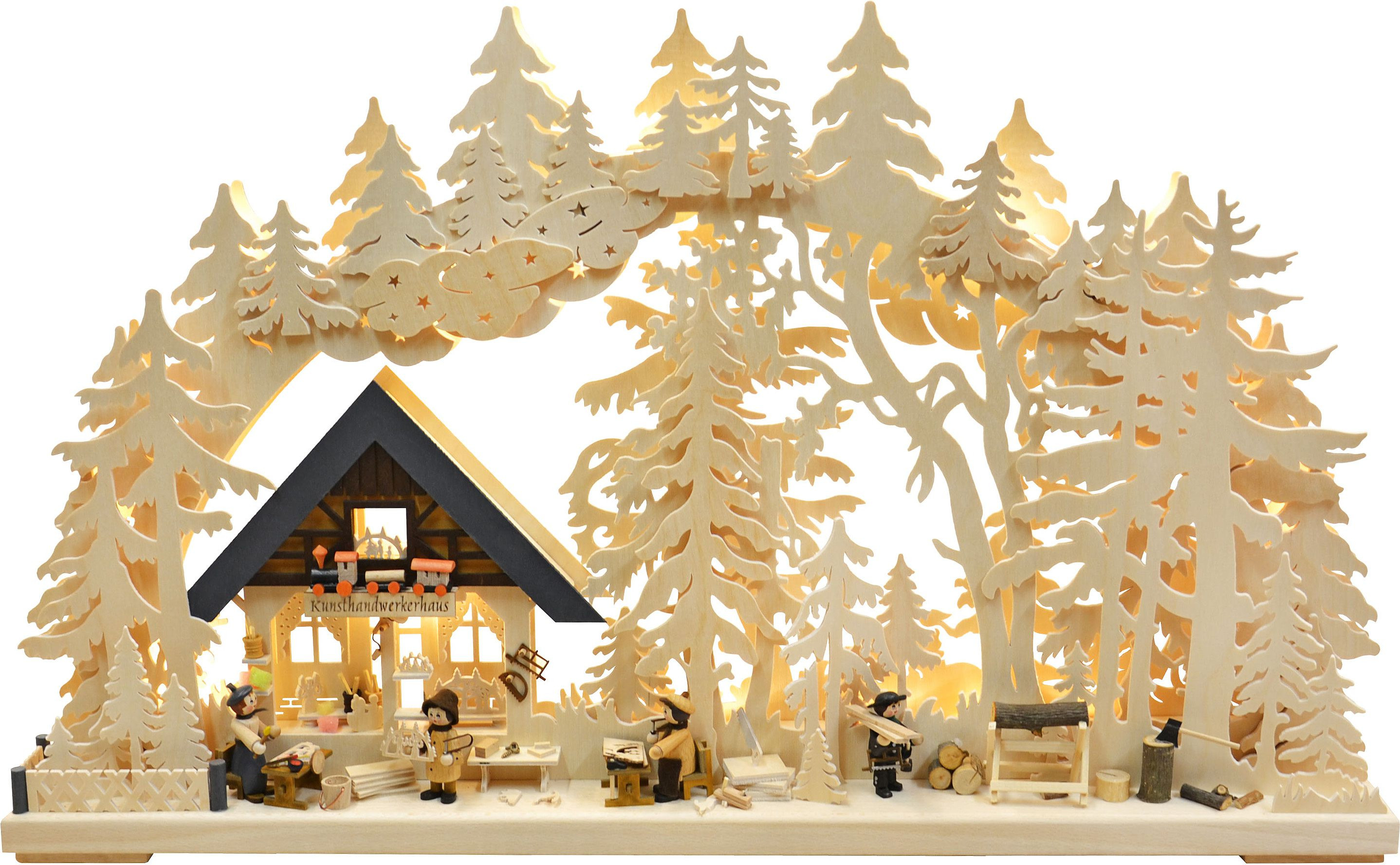 Auf dem 3D-Schwibbogen sieht man eine Schwibbogenwerkstatt mit vielen Figuren, welche die einzelnen Schritte der Herstellung eines Schwibbogens durchführen.