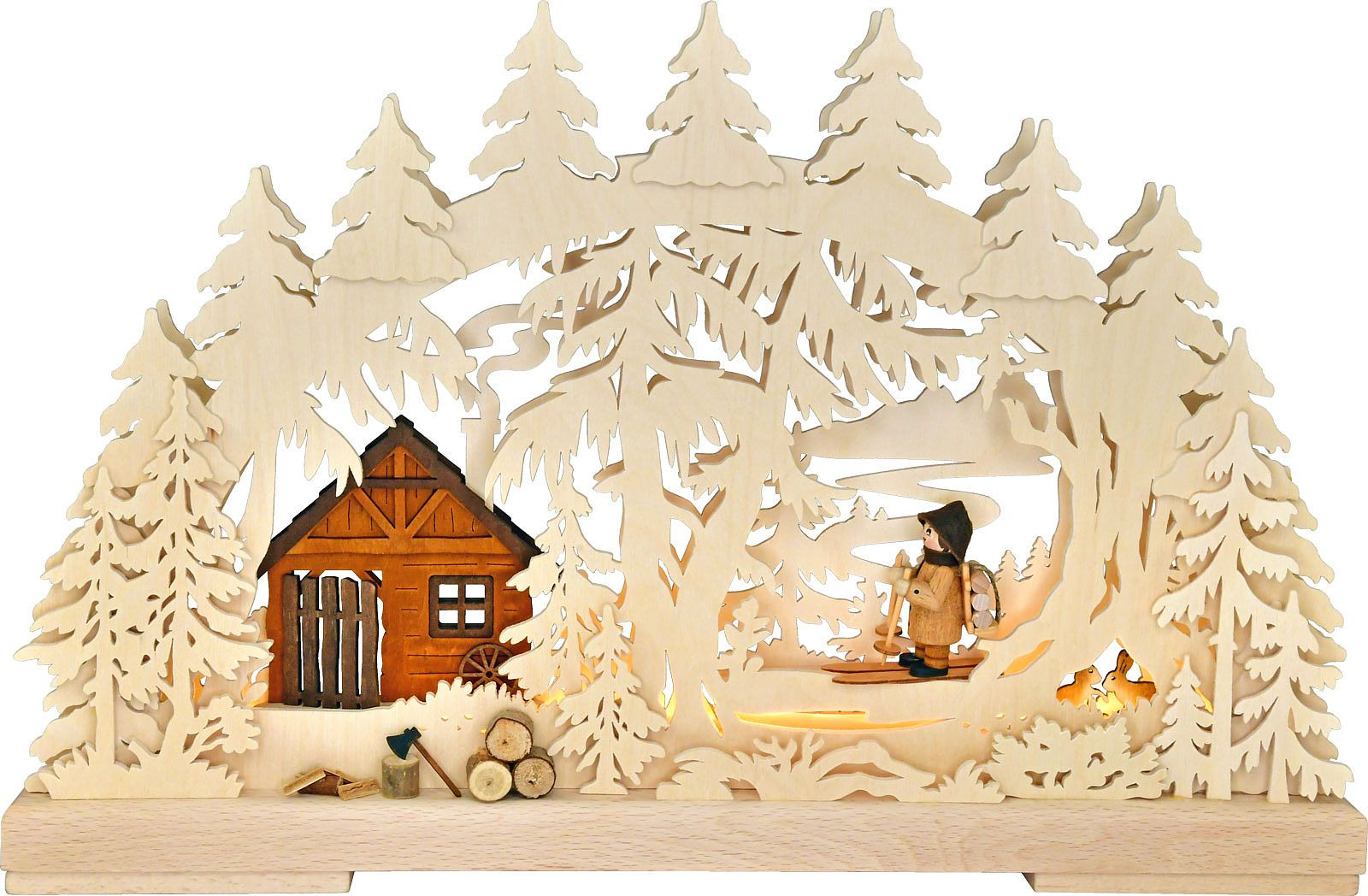 Der Waldarbeiter fährt mit seinen Skiern über die Waldloipe zu seiner Hütte.