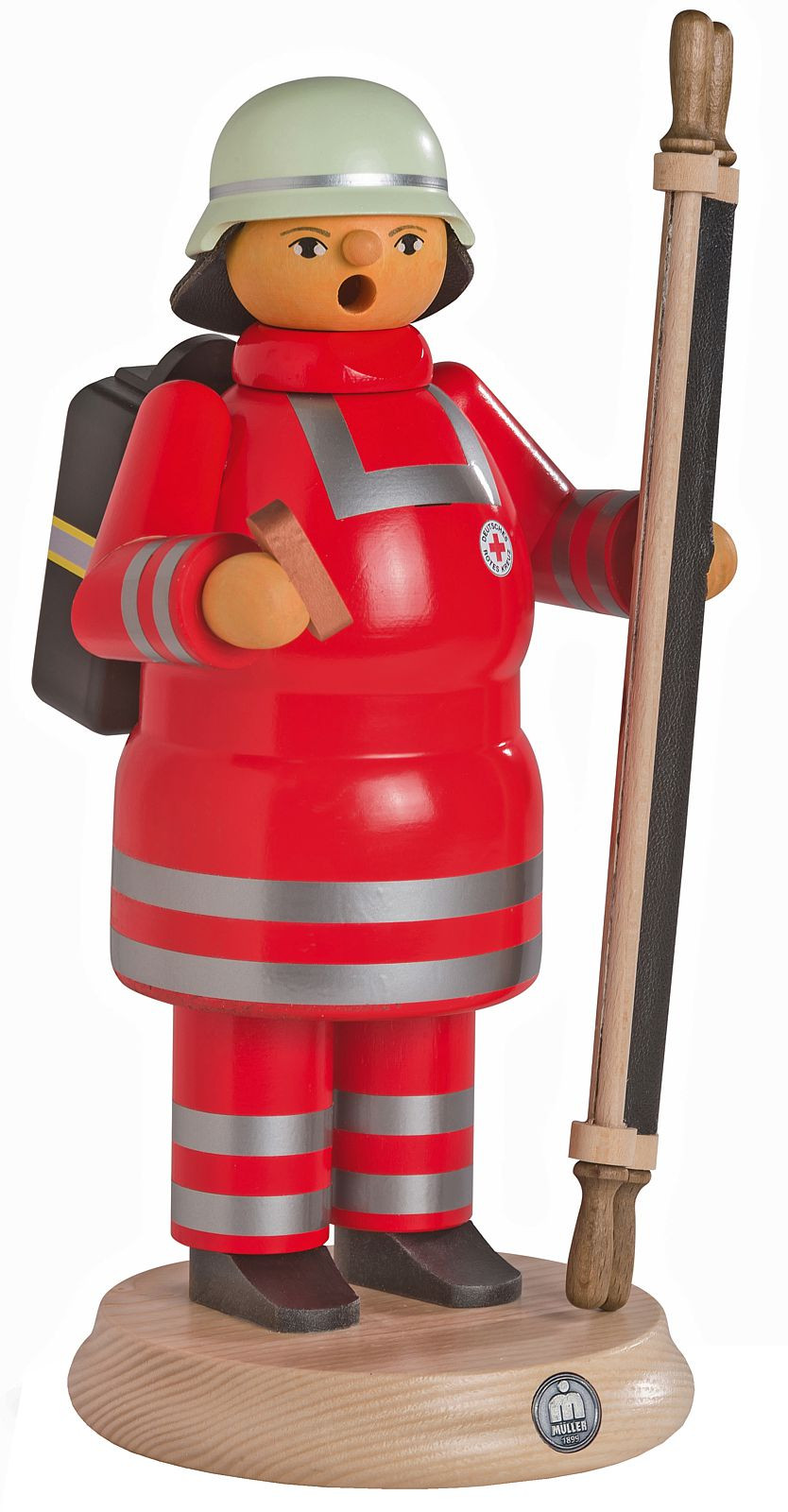 Der Sanitäter trägt rote Kleidung. Auf der Brust ist das Zeichen des Deutschen Roten Kreuzes zu sehen. Ein Helm schützt ihn bei Einsätzen. Den Erste-Hilfe-Koffer hat er sich auf den Rücken geschnallt. In einer Hand hält er eine Trage.