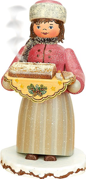 Das Stollenmädchen hält in seinen Händen ein Brett, welches mit einem hellen Tuch bedeckt ist. Darauf liegt ein angeschnittener Stollen.