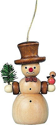 Ein schöner Baumbehang für die Weihnachts- bzw. Winterzeit. Auf seinem Kopf hat der Schneemann einen Zylinder. Er hält in einer Hand einen Tannenzweig. Ein Vogel hat sich auf seiner anderen Hand niedergelassen.