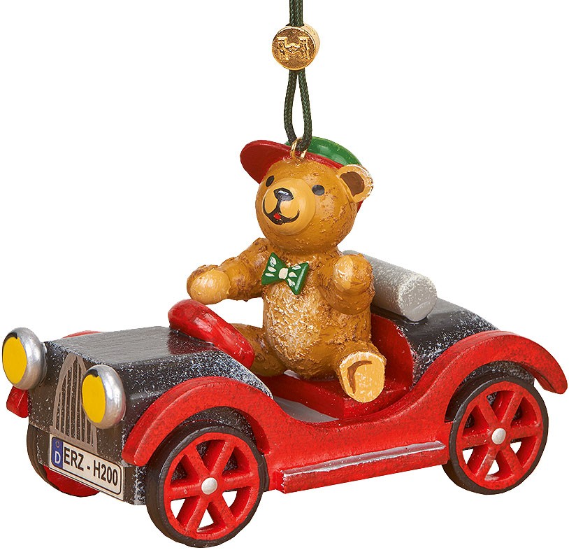 Ein Teddy sitzt in eine rot-silbernen Auto. Auf seinem Kopf sitzt eine grüne Mütze mit rotem Schirm. Eine grüne Fliege hat er sich um seinen Hals gebunden.