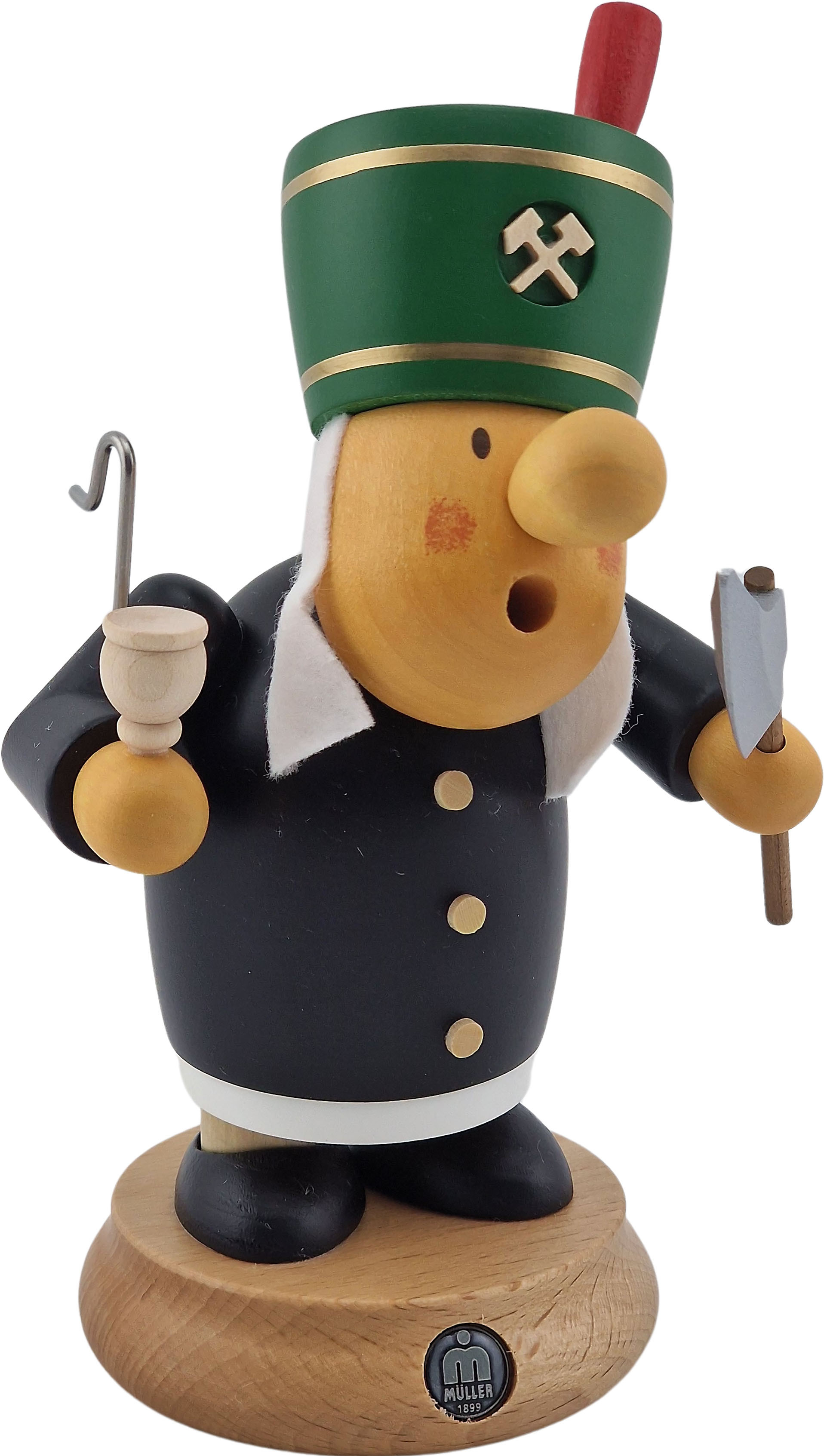 Das Müllerchen ist diesmal als Bergmann unterwegs. Bekleidet ist er mit schwarzer Jacke und grünen Hut. An diesem sind die gekreuzten Eisen und Schlegel zu sehen. In seinen Händen hält er eine Bergbarte und seine Pfeife.