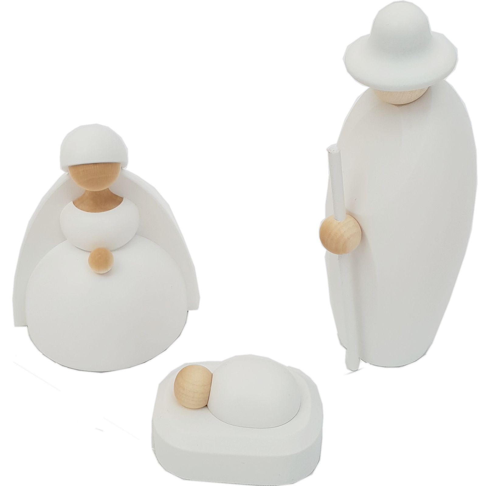 Maria sitzt neben der Krippe, in der ihr neugeborener Sohn liegt. Ihre Hände sind zum Gebet gefaltet. Josef steht daneben und hält in seinen Händen einen Wanderstab.