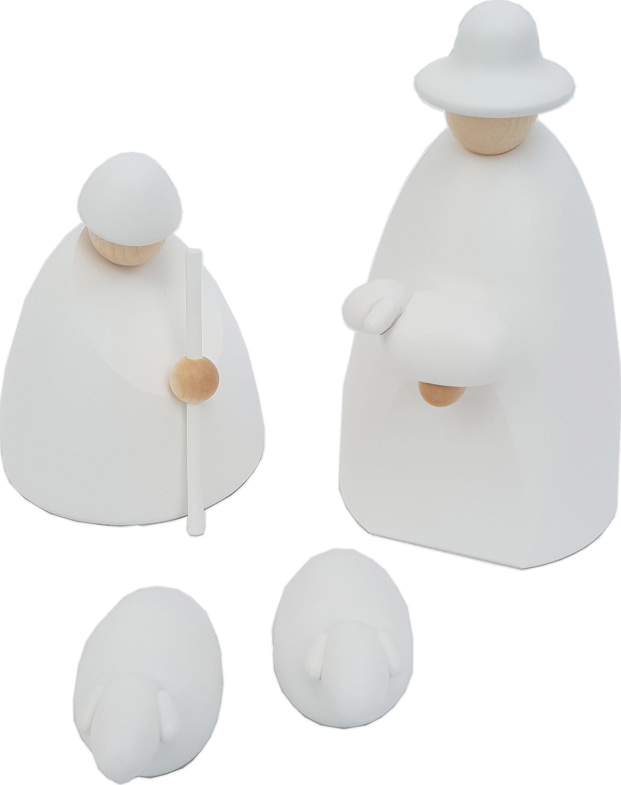 Die 2 Hirten und 2 Schafe gehören zum umfangreichen Set von Krippefiguren aus dem Hause Björn Köhler. Die große Hirte hält noch ein kleines Lamm in seinen Händen.