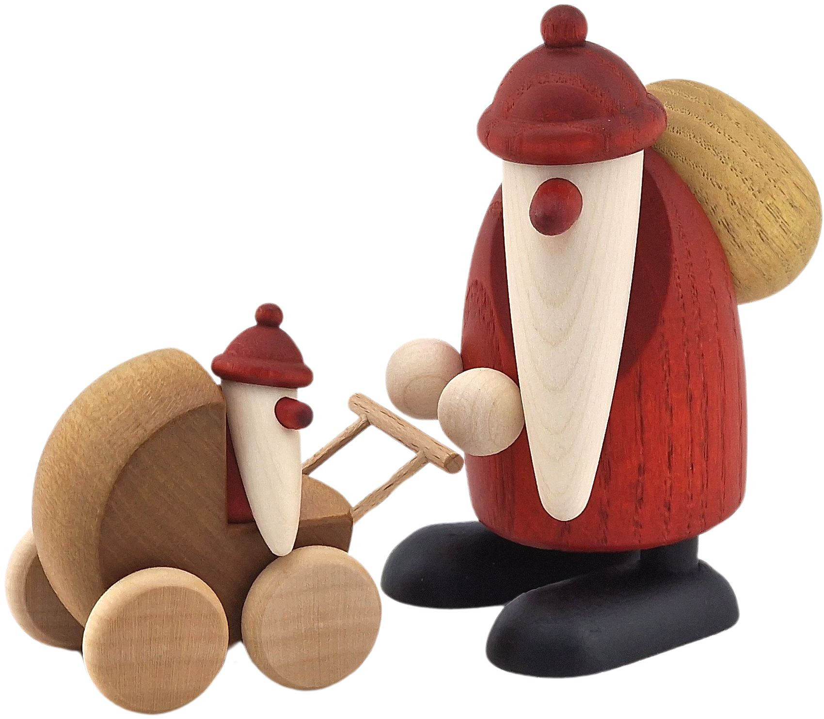 Der Weihnachtsmann schiebt einen Kinderwagen. Darin sitzt ein kleines Weihnachtsmännchen. Sie besitzen ein modernes Design, dem Markenzeichen der Firma Björn Köhler.