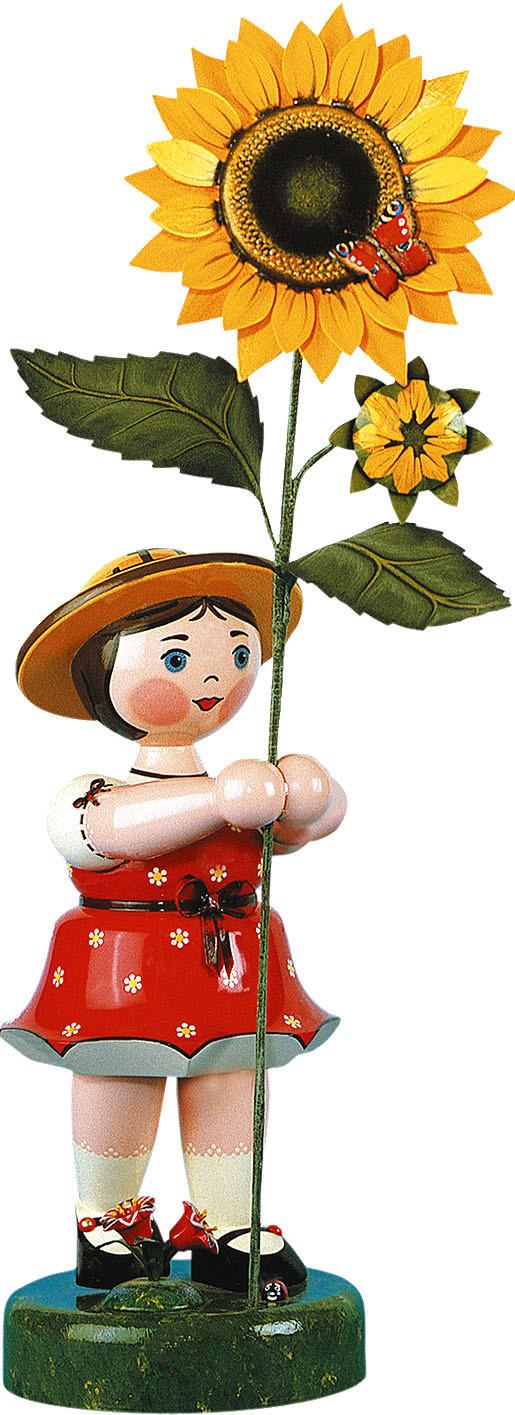 Das Mädchen trägt ein rotes Kleid. Die dunklen Haare werden von einem Sonnenhut verdeckt. In ihrer Hand hält sie eine Sonnenblume. Ein Schmetterling hat es sich auf den Kernen der Sonnenblume bequem gemacht. Vor dem Mädchen wächst auf der Wiese eine rote Blume und ein Marienkäfer krabbelt über die Wiese.