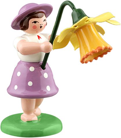 Blumenmädchen in buntem Kleidchen und mit Sonnenhut sowie einer Narzisse.