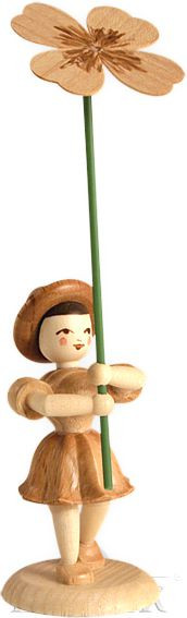 Das Blumenkind freut sich, denn es hat auf der Wiese ein vierblättriges Kleeblatt gefunden.