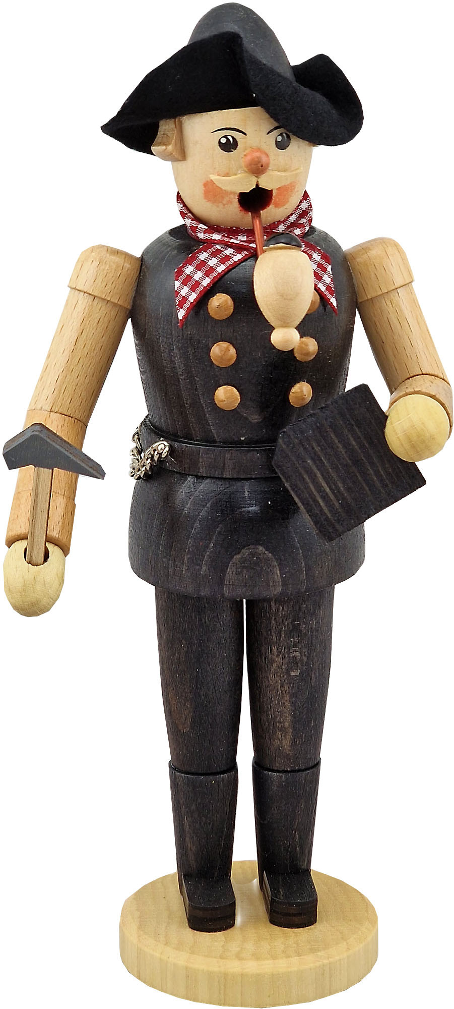 Dieser Dachdecker trägt dunkle Kleidung und ein rot-weiß kariertes Tuch. Er ist gerade dabei ein Dach mit Schiefer zu bedecken. In seinen Händen hält er eine Schieferplatte sowie einen Hammer.