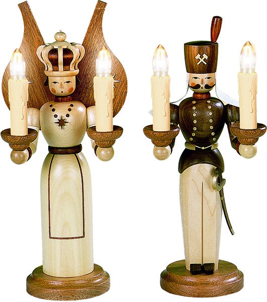 Engel und Bergmann stellt man zur Weihnachtszeit ins Fenster. Diese beiden Figuren des Herstellers Kleinkunst Müller aus Seiffen sind ca 27cm hoch und werden elektrisch beleuchtet.