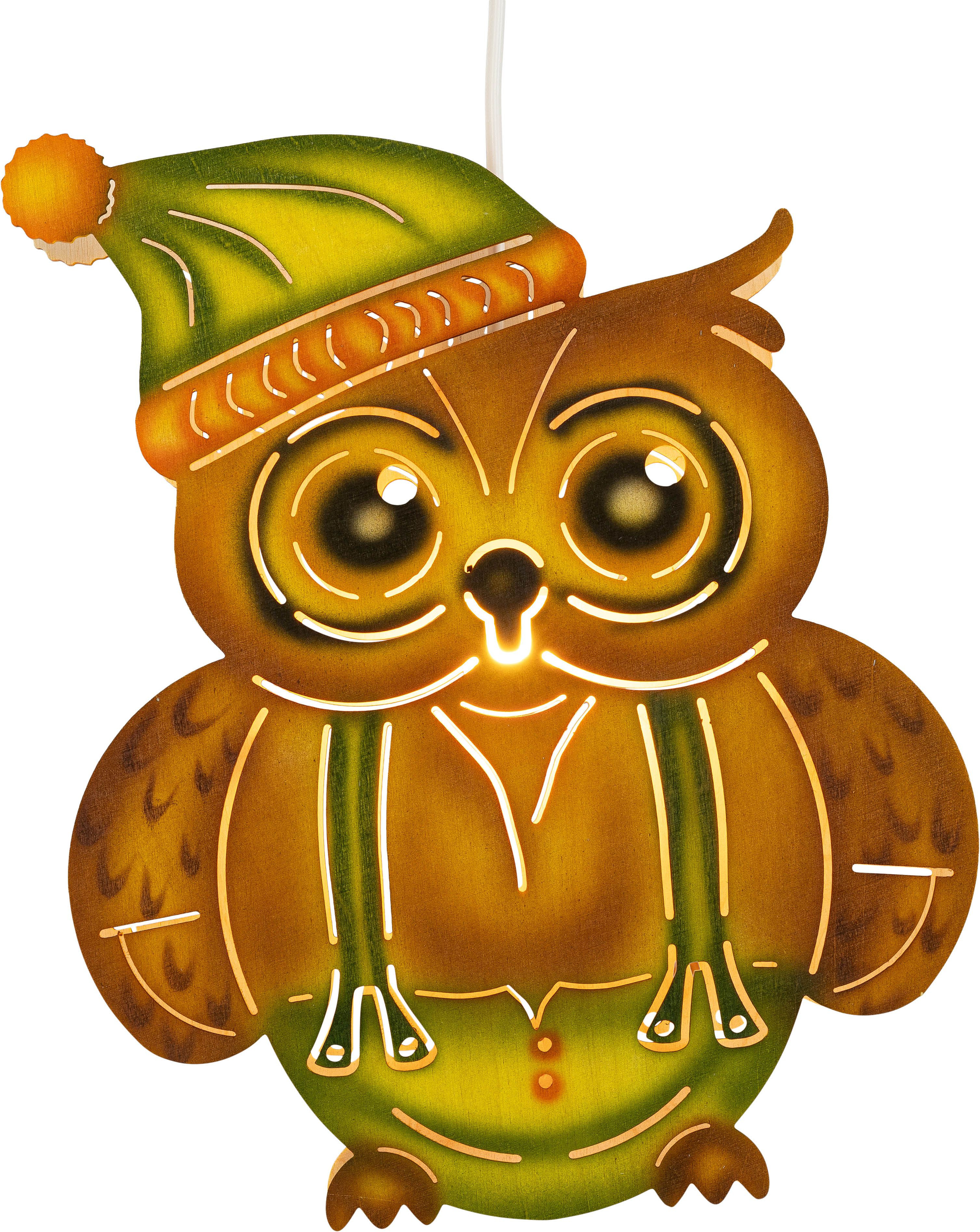 Das beleuchtete Fensterbild besitzt eine doppelte Motivplatte. Die Eule hat auf dem Kopf eine Bommelmütze. Es wurden auf beiden verschiedene Lichtschlitze ausgefräst. Diese stellen Augen, Schnabel, Streifen auf der Mütze, Hosenträger, Hosen, Knöpfe und den Halsausschnitt des Hemdes dar.