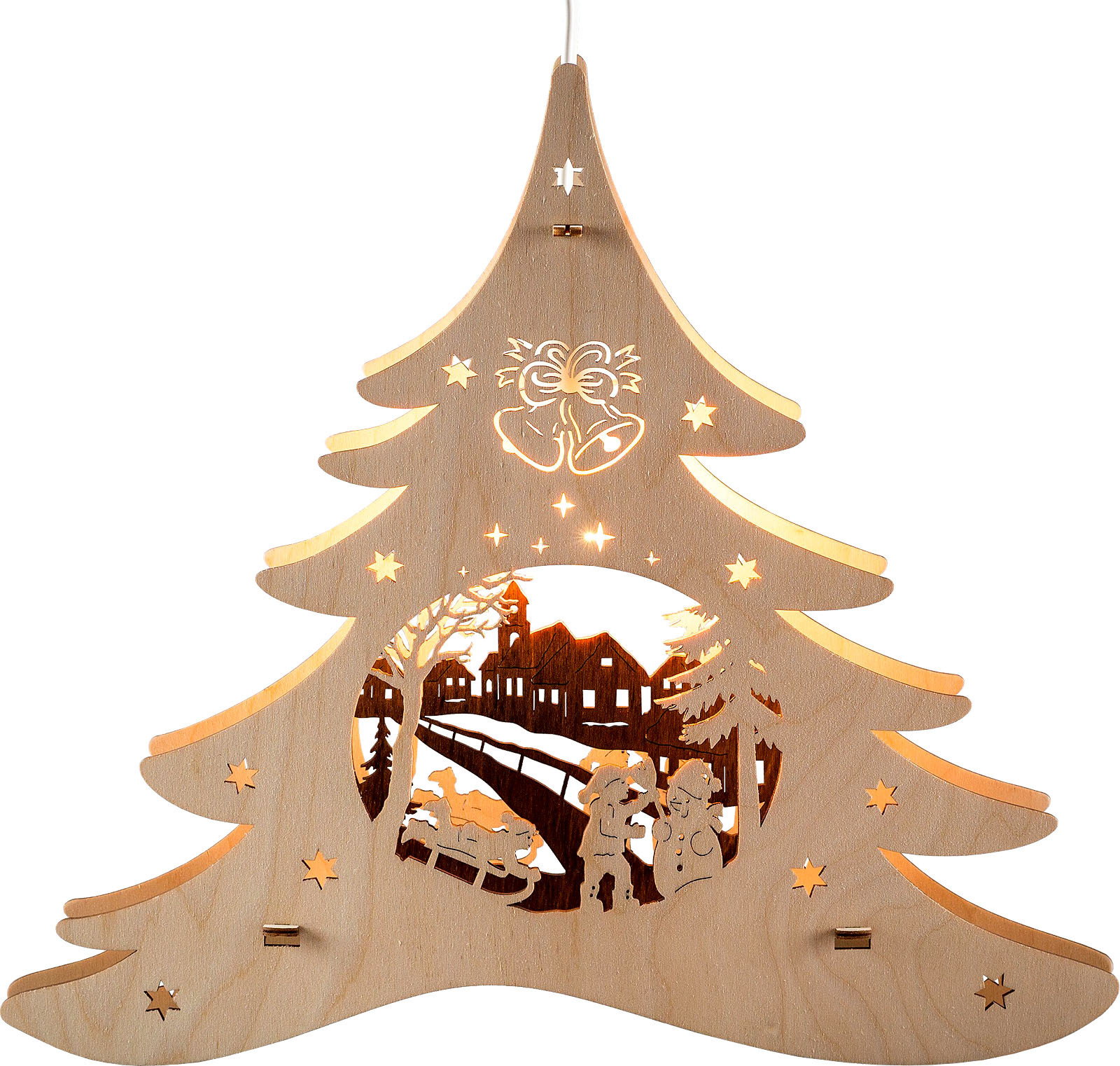 Das beleuchtete Fensterbild hat die Form eines Tannenbaumes. In der Mitte sind eine Kirche und Häuser zu sehen. Kinder fahren mit dem Schlitten einen Berg hinunter und bauen einen Schneemann.