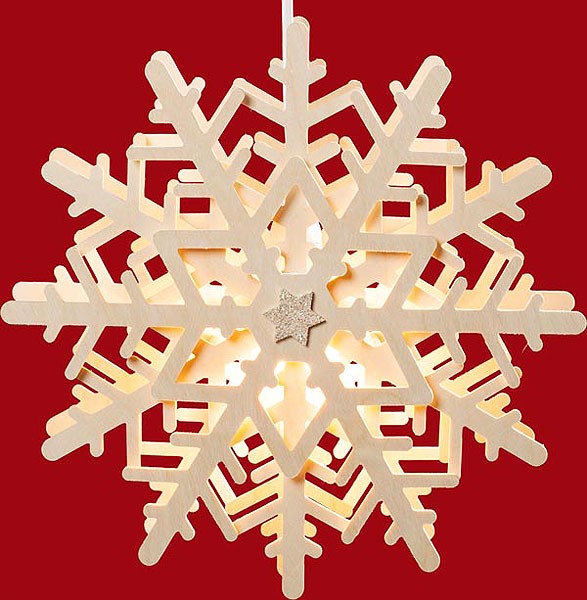 Die Form eines Schneekristalls hat dieses Fensterbild. Es besteht aus zwei Platten, welche durch eine Plattform und Holzleisten miteinander verbunden sind. Dadurch entsteht eine 3D-Optik.