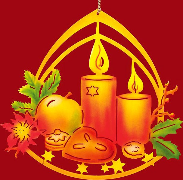 Das farbige Fensterbild zeigt zwei brennende Kerzen. Um diese herum liegen ein Apfel, ein Lebkuchenherz, ein Plätzchen, eine Nuss und Mistelzweige. Goldene Sterne sind unter den Naschereien zu sehen.