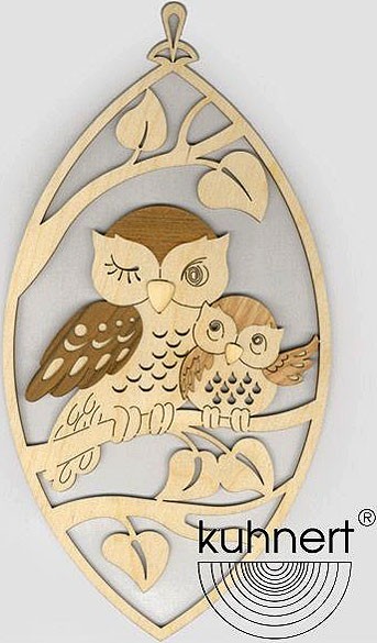 Eine Eulenmutter sitzt mit ihrem Kind auf einem Ast. Durch die Benutzung von Applikationen aus Edelholzfurnieren wird hier eine unterschiedliche Farbgebung erreicht.