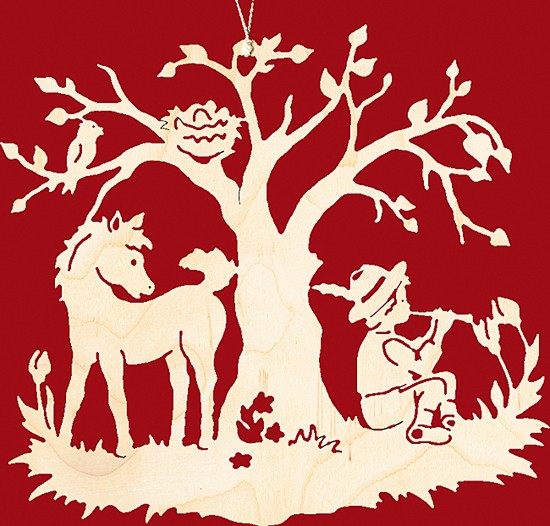 Ein Junge sitzt auf einer Wiese unter einem Baum und spielt auf einer Flöte. Hinter dem Baum befindet sich ein Pferd, welches den Kopf gewendet hat und zu dem Jungen schaut. Ein Vogelnest ist in einer Astgabel zu sehen. Über dem Pferdekopf sitzt ein Vogel auf einem Ast.