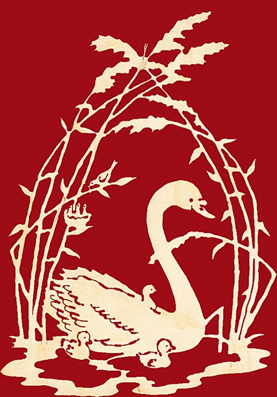 Auf einem See schwimmt ein Schwan mit seinen Kücken. Eines davon sitzt auf seinem Rücken. Über ihnen beugt sich das Schild und bildet ein Dach. Im Schilf befindet sich ein Vogelnest. Die Vogelmutter sitzt auf einem Schilfhalm und beugt sich mit einem Wurm im Schnabel zum Nest hinunter.