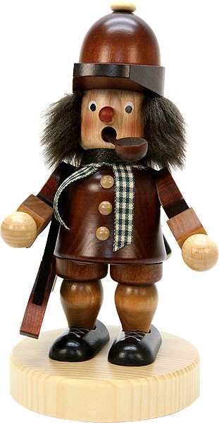 Der Räuchermann Förster trägt eine dunkelbraune Kleidung. Um den Hals hat er sich ein schwarz-weiß kariertes Tuch gebunden. Auf seinem Kopf sitzt eine dunkelbraune Schirmmütze und im Mund hat er eine Pfeife. Seine Haare sind ebenfalls dunkel. Sein Gewehr hat er sich über die rechte Schulter gehängt.