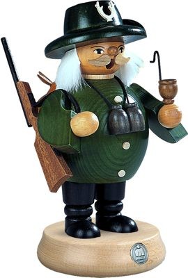 Bei seiner täglichen Runde durch den Wald raucht der Förster seine Pfeife. Er hat sich schon einen Hasen geschossen, welcher aus seinem Rucksack auf dem Rücken herausschaut. Jetzt trägt er sein Gewehr über die Schulter. Um seinem Hals hängt ein Fernglas.