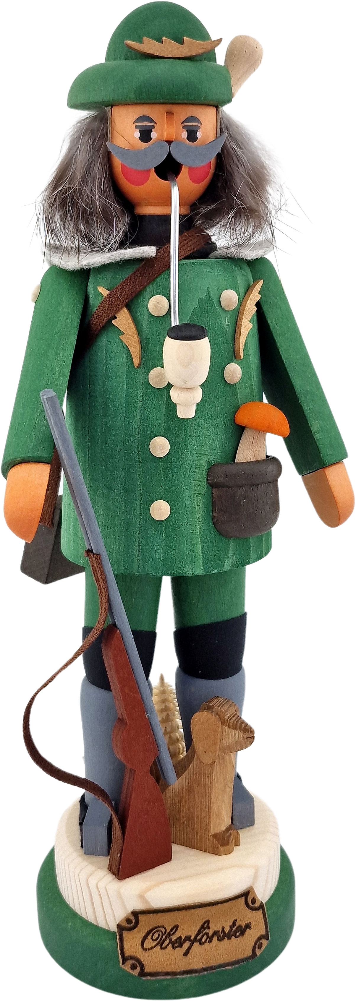 Der Oberförster trägt wie die meisten Förster grüne Kleidung. Sein Gewehr hat er auf den Boden gestellt und sein Hund sitzt vor seinen Füßen. Eine kleine Tasche hat er sich umgehängt und auch einen Pilz in die Jackentasche gesteckt. Am Sockel wurde ein Schild mit der Aufschrift Oberförster angebracht.