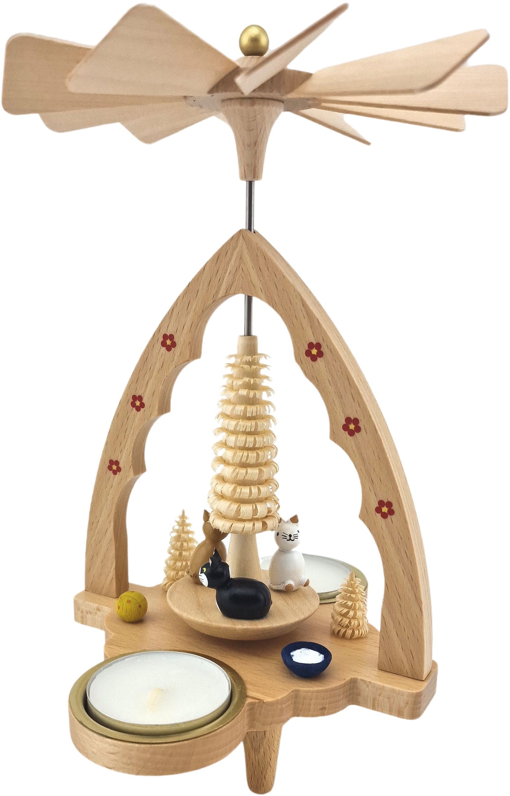Auf der Drehscheibe Pyramide befinden sich 3 Katzen, eine weiße, eine braune und eine schwarz-weiße. Neben der Scheibe stehen kleine Spanbäume, eine blaue Schale mit Milch und ein gelber Ball mit roten Punkten.