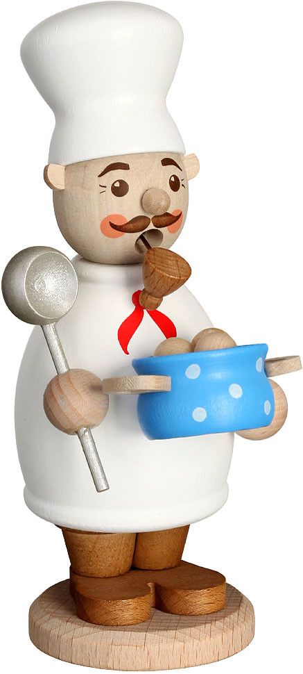 Der Koch trägt weiße Kleidung und eine weiße Kochmütze. In seinen Händen hält er einen blauen Topf mit Klößen und eine Kelle.