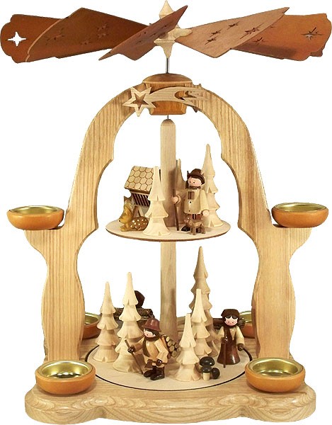 Diese Pyramide zeigt verschieden Leute im Wald. Auf dem unteren Drehteller sieht man Bäume und Pilze. Dazwischen gehen Holzsammler und Reißigsammlerinen. In den Händen halten sie Wanderstöcke. Der Holzsammler hat zudem eine Axt in der Hand. Neben der Drehscheibe sind 4 Lichtertüllen für Pyramidenteelichte angebracht.