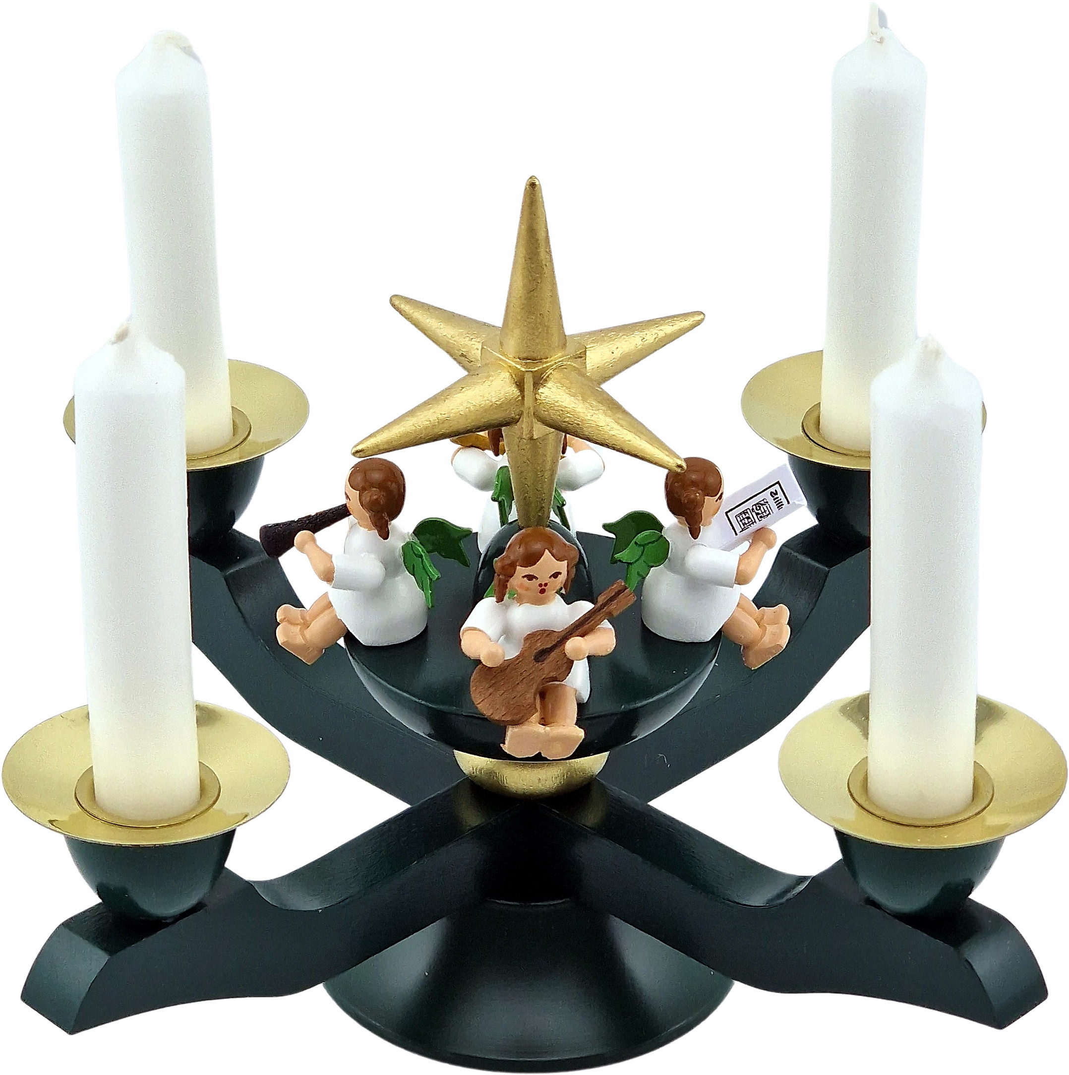 Der Adventsleuchter in grün ist für Pyramidenkerzen geeignet. In der Mitte befindet sich eine Plattform, auf deren Kante vier Engel mit Musikinstrumenten sitzen. Ein goldener Stern befindet sich in der Mitte der Holzplattform. Er steckt auf einem Stab, so das er über den Köpfen der Engel leuchtet.