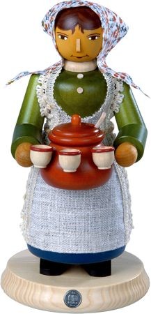 Die Verkäuferin hält in ihren Händen einen Topf mit Glühwein. Eine Schöpfkelle schaut aus dem Topf heraus. Drei Tassen hängen am Topf.