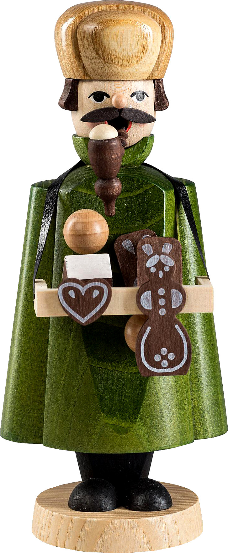Der Pfefferkuchenverkäufer ist auf dem Weihnachtsmarkt eingetroffen. Er hat sich seinen Bauchladen mit verschiedenen Pfefferkuchen umgehängt.