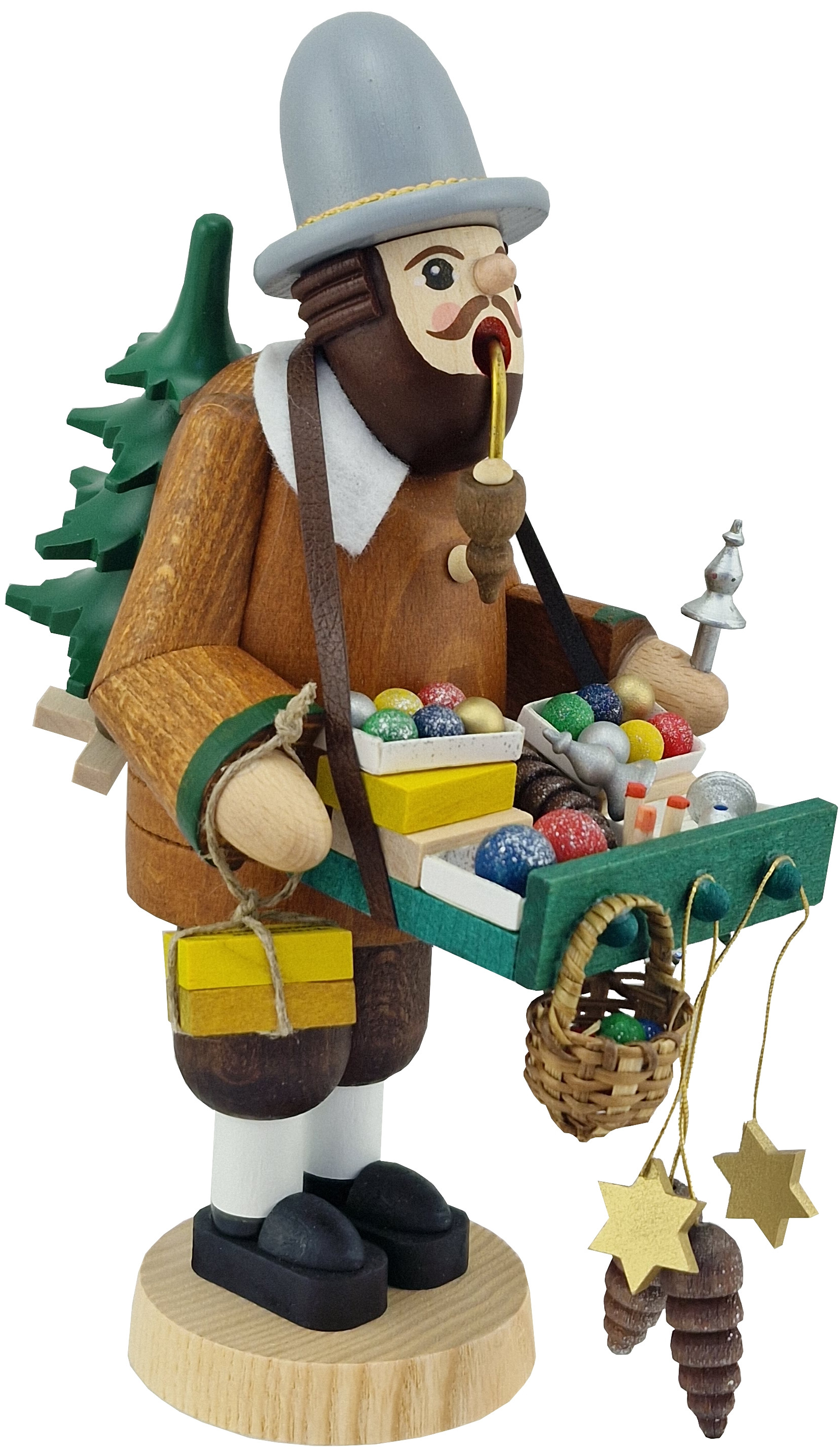 Mit seinem Bauchladen bietet der Händler auf Weihnachtsmärkten Weihnachtsbaumschmuck an. Auf seinem Rücken ist ein kleiner Tannenbaum zu sehen.