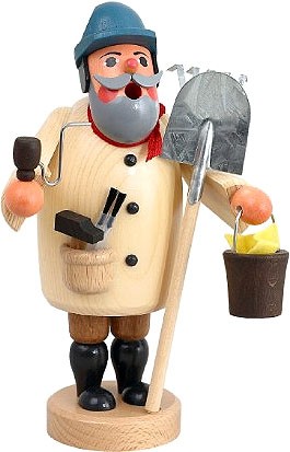Mit seinen Arbeitsmaterialien in den Händen gönnt sich der Hausmeister zum Feierabend eine Pfeife.