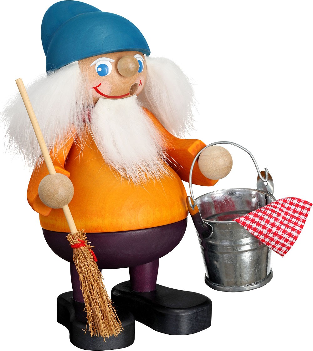 Das Heinzelmännchen hat weiße Haare und einen langen, weißen Bart. Auf seinem Kopf sitzt eine blaue Zipfelmütze. Bekleidet ist er mit einem gelben Pullover, pflaumfarbener Hose und schwarzen Schuhen. Er hält in seinen Händen Besen und Putzeimer mit Lappen.