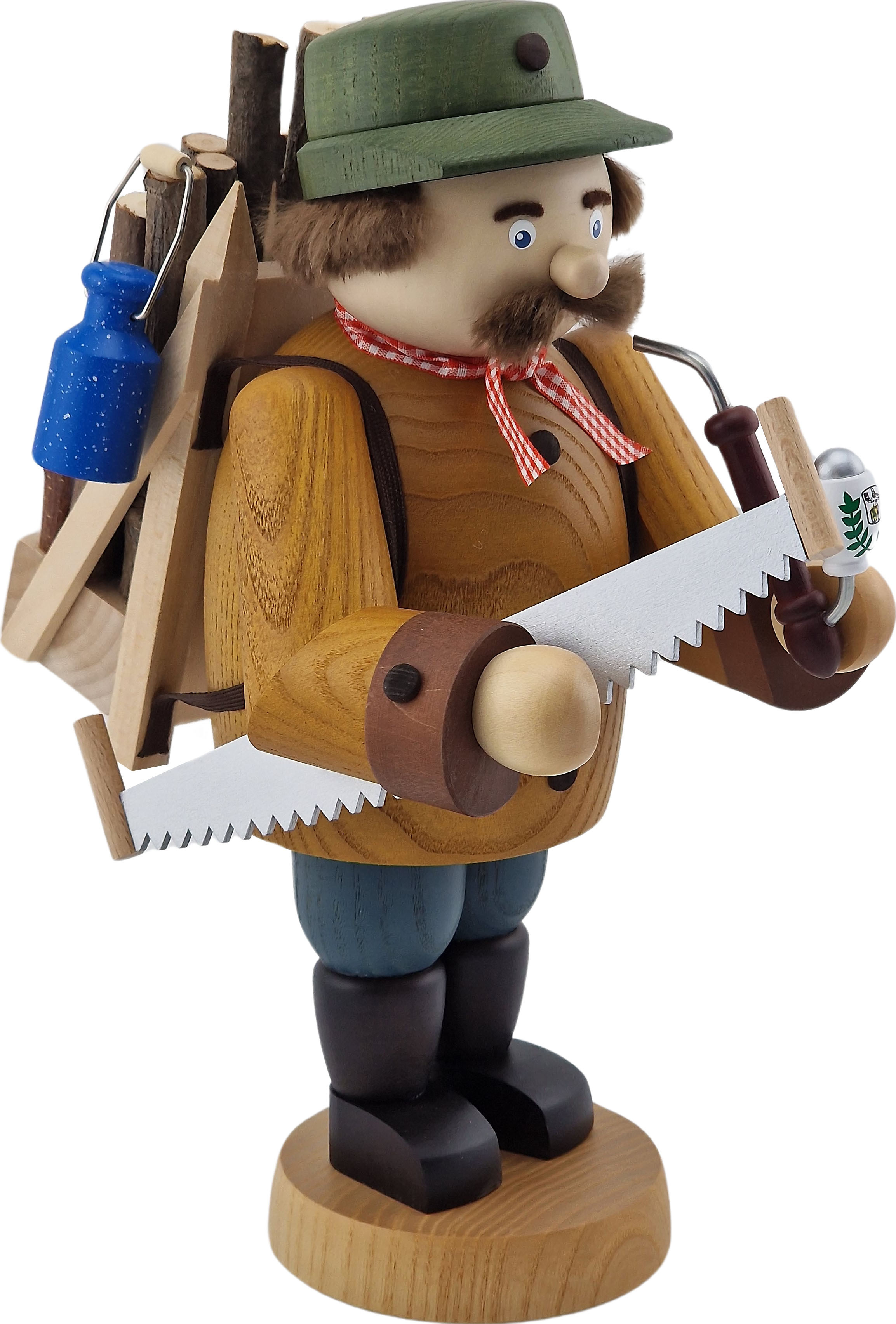 Der Holzmacher kommt gerade aus dem Wald. Seine Kiepe auf dem Rücken ist gefüllt. Seine Trinkflasche hat er daran befestigt. Er hält in einer Hand seine Säge und in der anderen seine Pfeife, die er in aller Ruhe raucht.