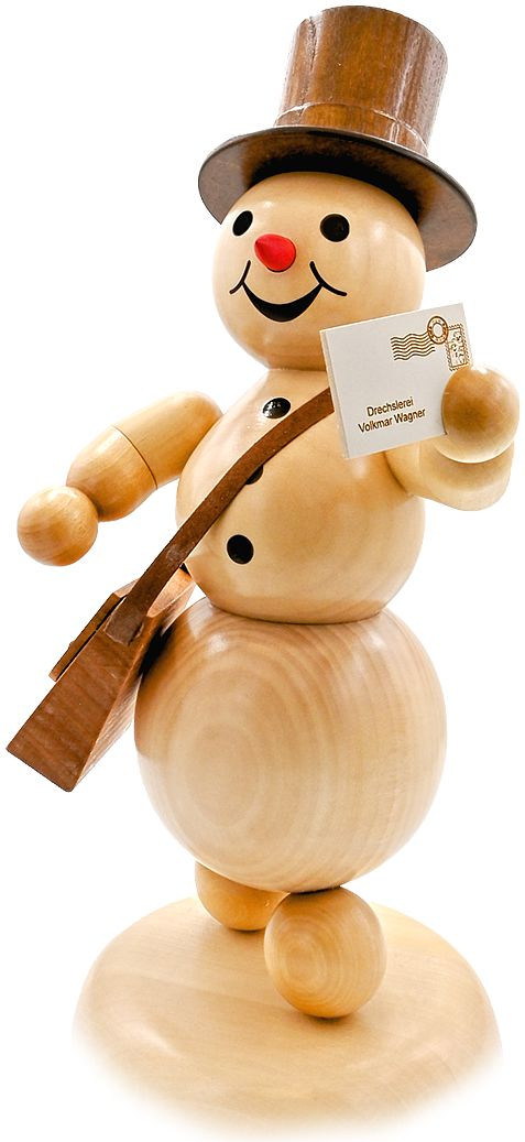 Der Schneemann trägt freundlich lächelnd die Briefe an seine Freunde aus.
