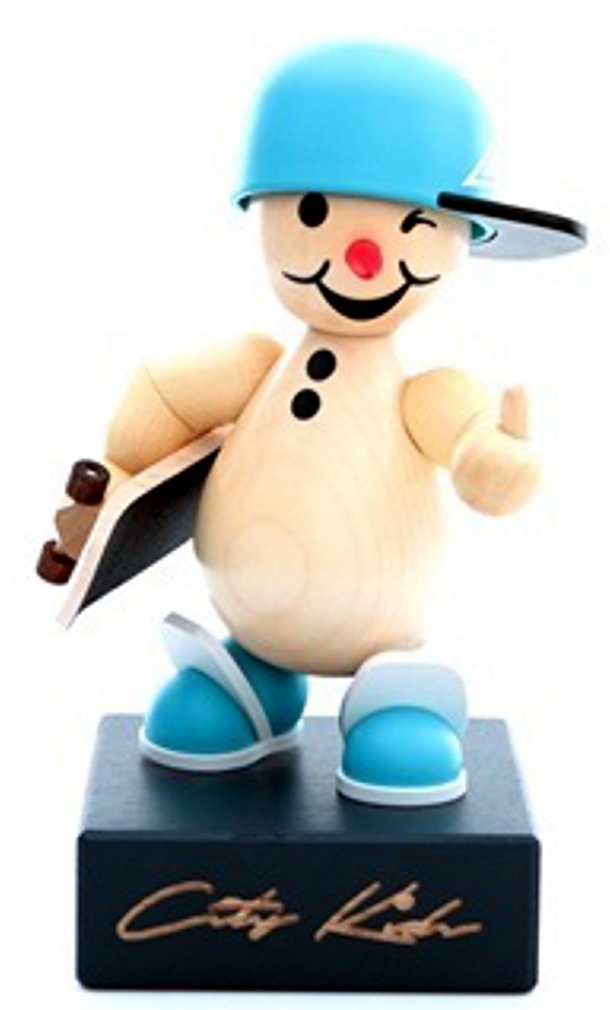 Dieses City Kid trägt den Namen Jayson. Er trägt ein Skatbord unterm Arm. Auf seinem Kopf sitzt eine helblaue Schirmmütze mit weißem Schild. Auch die Schuhe an ihren Füßen sind blau weiß.