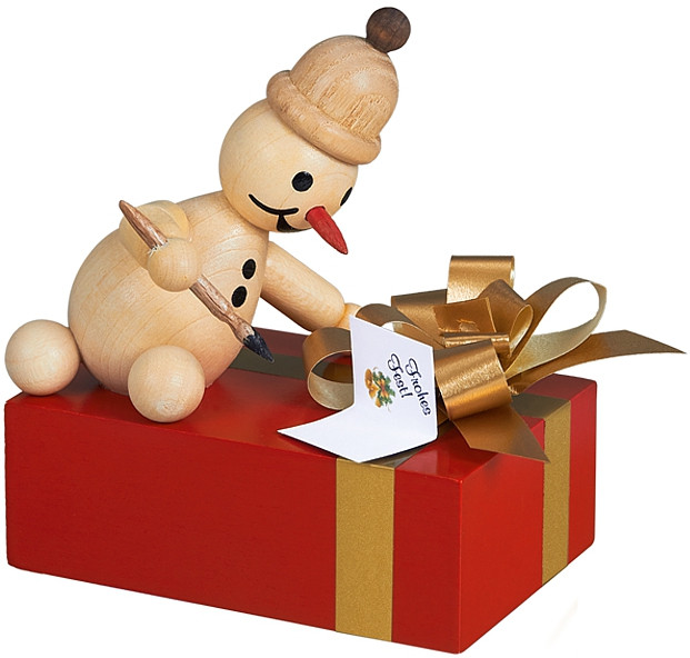 Der Junior sitzt auf einem Geschenk und schreibt mit einem Pinsel ein Namensschild.