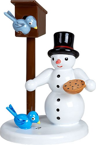 Neben einem Vogelhaus steht ein Schneemann. Er hat einen schwarzen Zylinder mit rotem Band auf dem Kopf. In seiner linken Hand hält er eine Schüssel mit Vogelfutter. Dieses streut er mit der anderen auf den Schnee. Ein blauer Vogel sitzt im Schnee und pickt die Körner auf. Auf der Vorstange am Vogelhaus sitzt ein weiterer bläulicher Vogel und schaut neugierig nach unten.