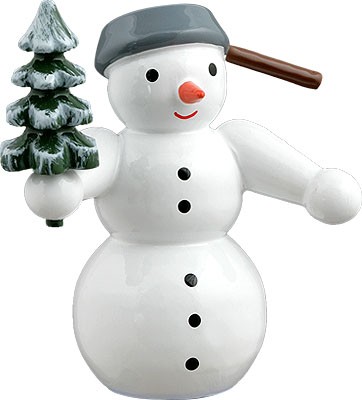 Der Schneemann hat schwarze Punkte auf seinem Bauch. Auch seine Augen sind schwarz. Seine Nase ist eine rote Karotte und der rote Mund zeigt ein Lächeln. Ein Pfanne mit braunem Stiel sitzt auf seinem Kopf. Er hält ein einer Hand einen grünen Tannenbaum. Dieser ist mit Schnee bedeckt.