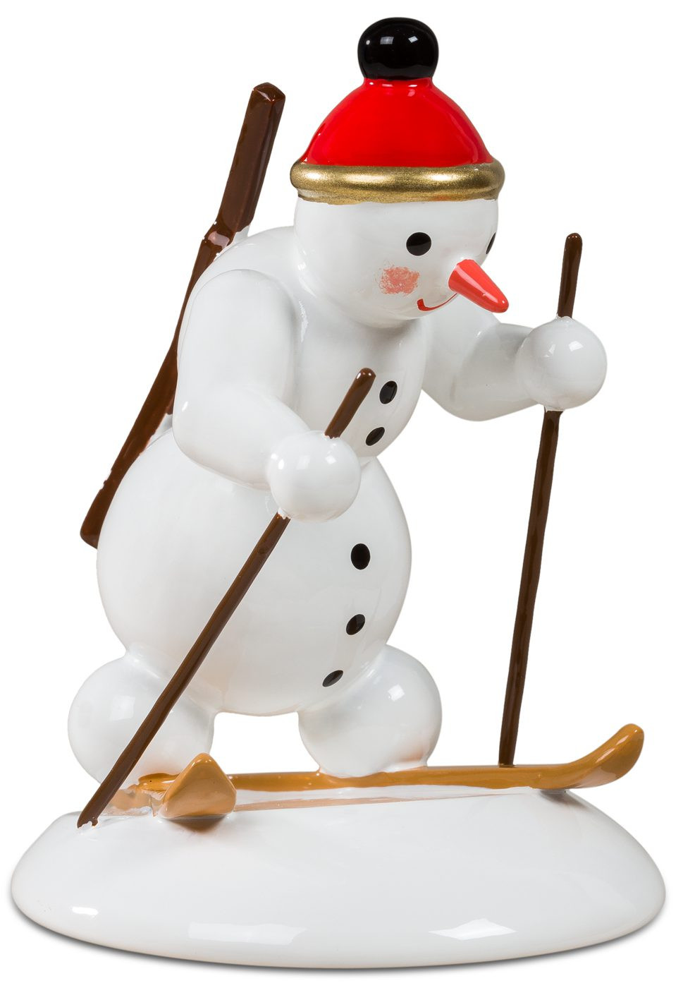 Der Schneemann ist als Biathlet unterwegs. Auf seinem Kopf sitzt eine rote Mütze mit schwarzer Bommel. Das Gewehr hat er sich auf den Rücken gehängt.