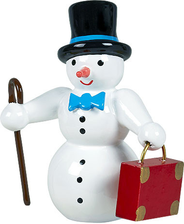 Der Schneemann hat sich einen schwarzen Zylinder aufgesetzt. Er hält einen Koffer und einen Stock in seinen Händen. Um seinen Hals hat er sich eine blaue Fliege gebunden.