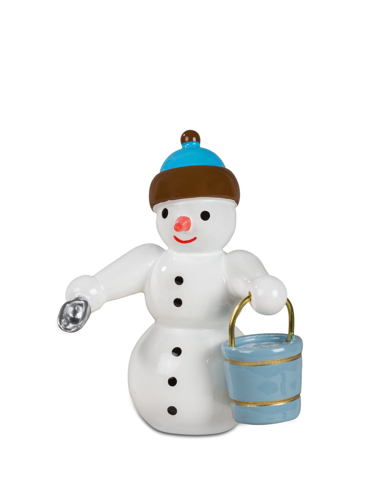 Mit einer kleinen Schaufel in der rechten und einem Eimer in der linken Hand ist dieser Schneemann bereit die Aufgabe des Streudienstes zu übernehmen. Auf dem Kopf trägt er eine blau-braun gestreifte Mütze. Höhe: 6,5 cm