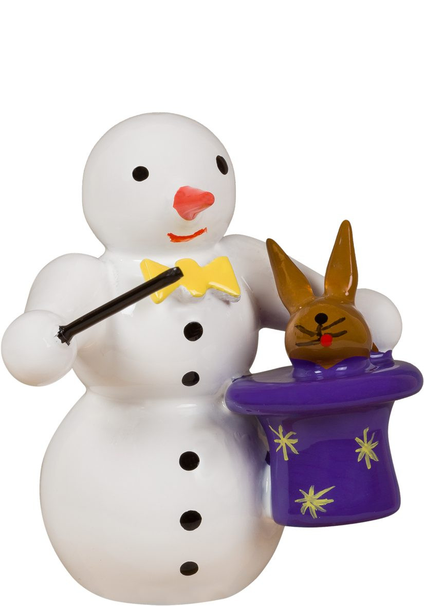 Dieser Schneemann hält in seiner linken Hand einen Zauberstab und in seiner rechten Hand einen Zauberhut, aus dem er ein Kaninchen herauszaubert. Höhe: 6,5 cm