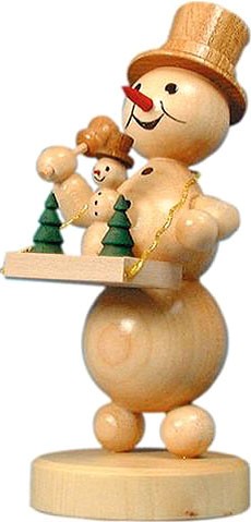 Der Schneemann ist als Händler mit einem Bauchladen auf dem Weihnachtsmarkt unterwegs, welchen er sich umgehängt hat. Hier will er einen kleinen Schneemann sowie grüne Bäume verkaufen. In einer Hand hält er eine kleine Glocke, mit der er auf sich aufmerksam macht. Ein Zylinder sitzt auf seinem Kopf.
