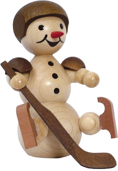 Der Schneemann spielt Eishockey. Dazu hat er sich einen Helm aufgesetzt, Schlittschuhe und Schutzpolster für die Schultern angezogen. In einer Hand hält er den Schläger. Während des Spiels ist er hingefallen und sitzt jetzt auf seinem Po.
