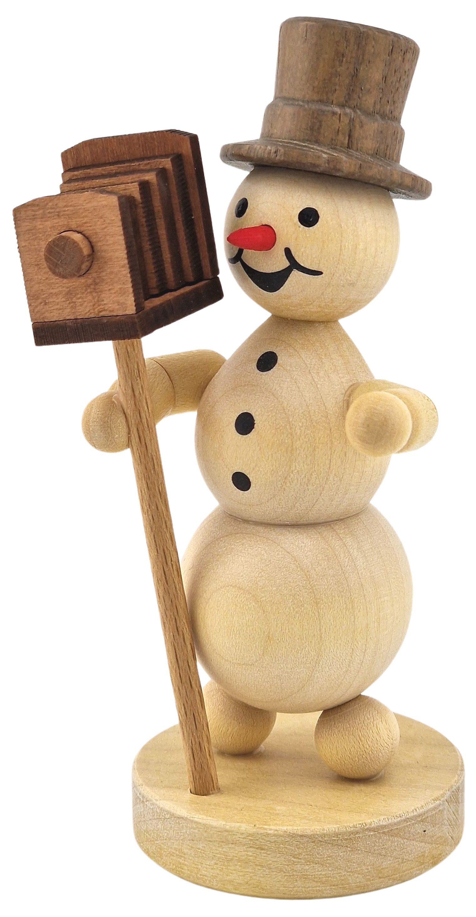 Der Schneemann Fotograf ist bereit mit seiner Kamera schöne Bilder zu knipsen.